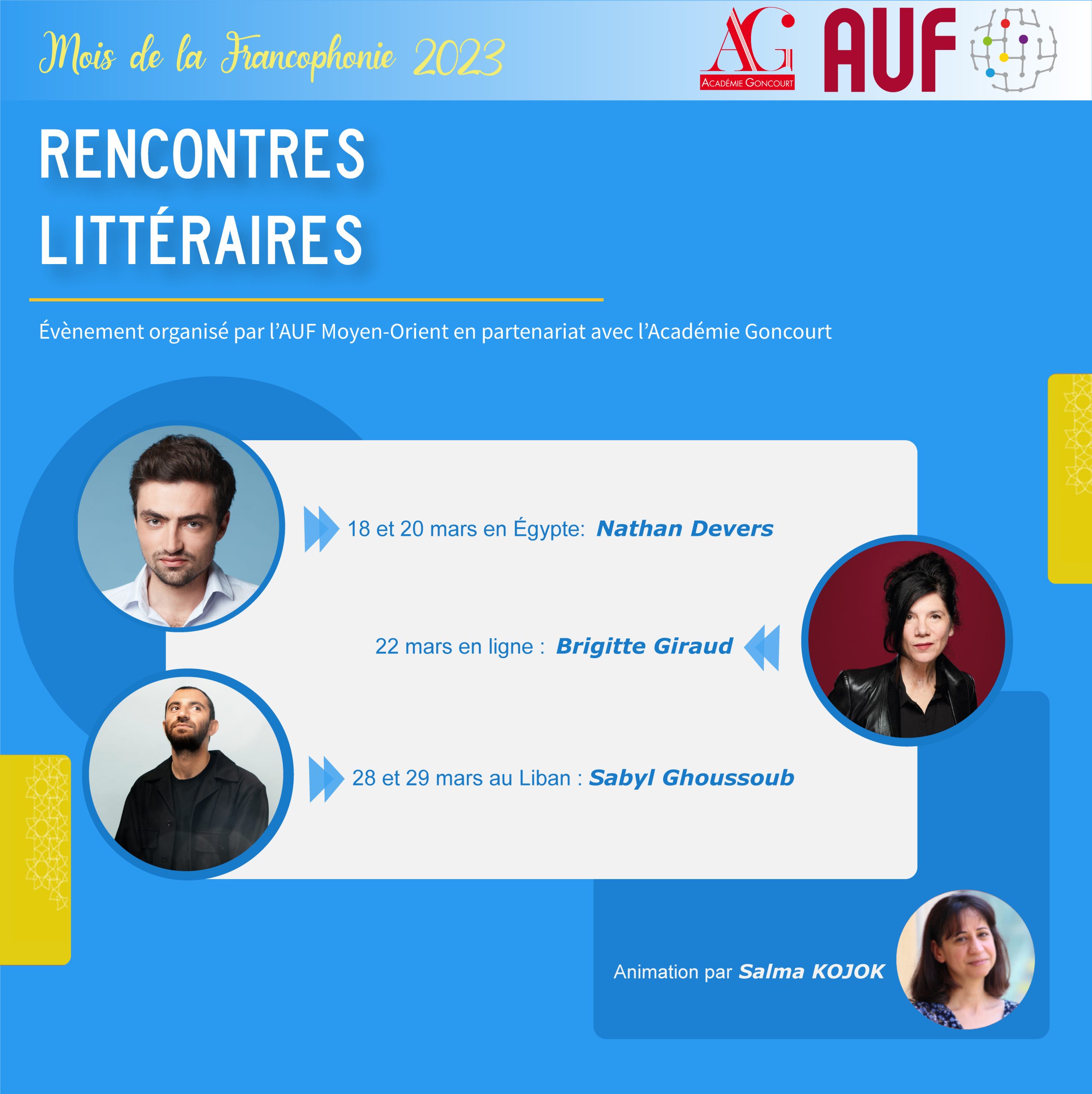 À l'occasion du mois de la Francophonie, et dans la continuité du prix littéraire « Choix Goncourt de l’Orient », un programme de rencontres et de webinaires littéraires avec des auteurs de la sélection Goncourt 2022 est organisé par l’AUF Moyen-Orient en partenariat avec l’Académie Goncourt :