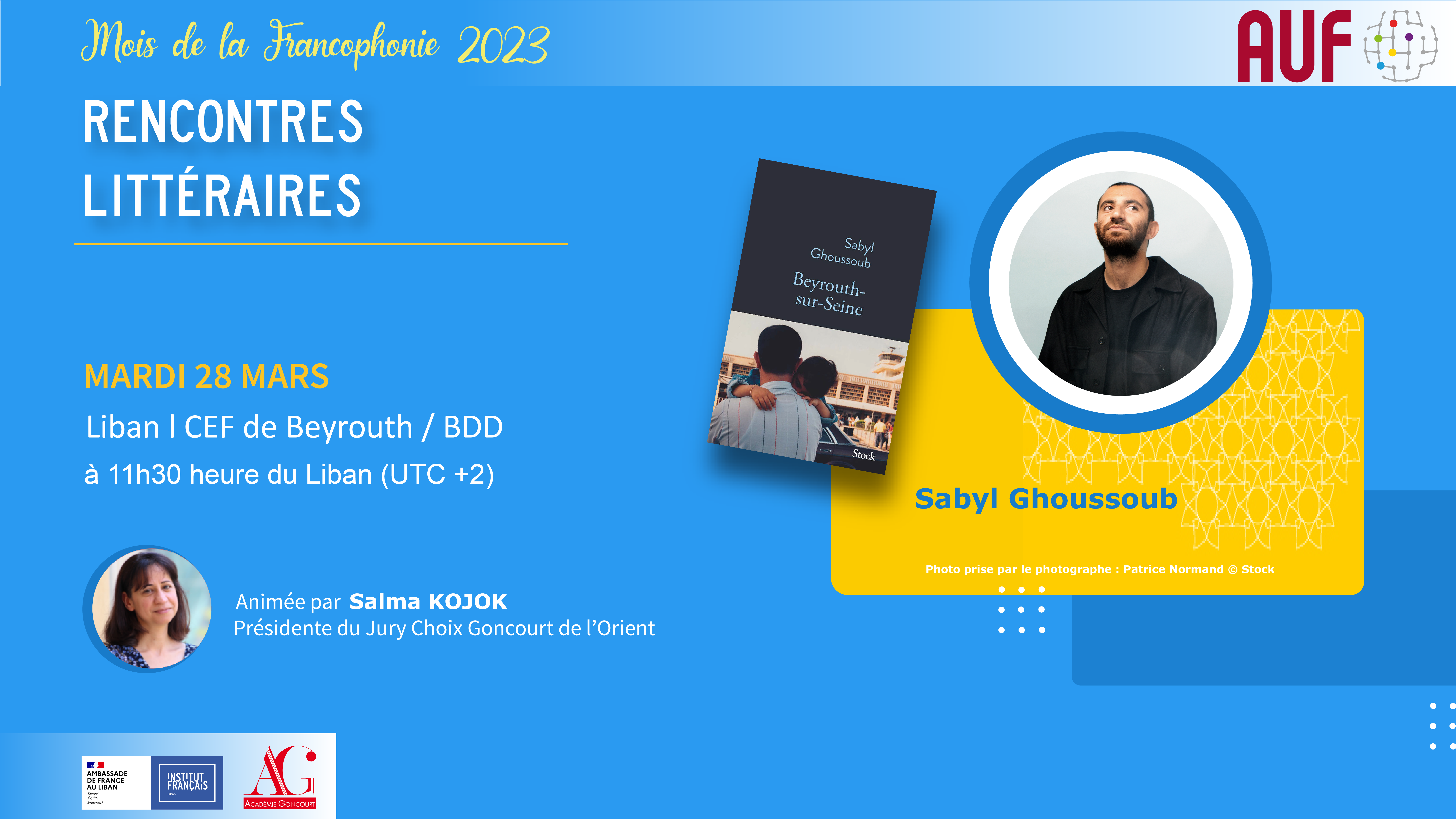 Dans le cadre du mois de la francophonie, l’Agence Universitaire de la Francophonie (AUF) au Moyen-Orient, en partenariat avec l’Institut français du Liban (IFL), organise deux rencontres littéraires avec l’écrivain Sabyl Ghoussoub.
