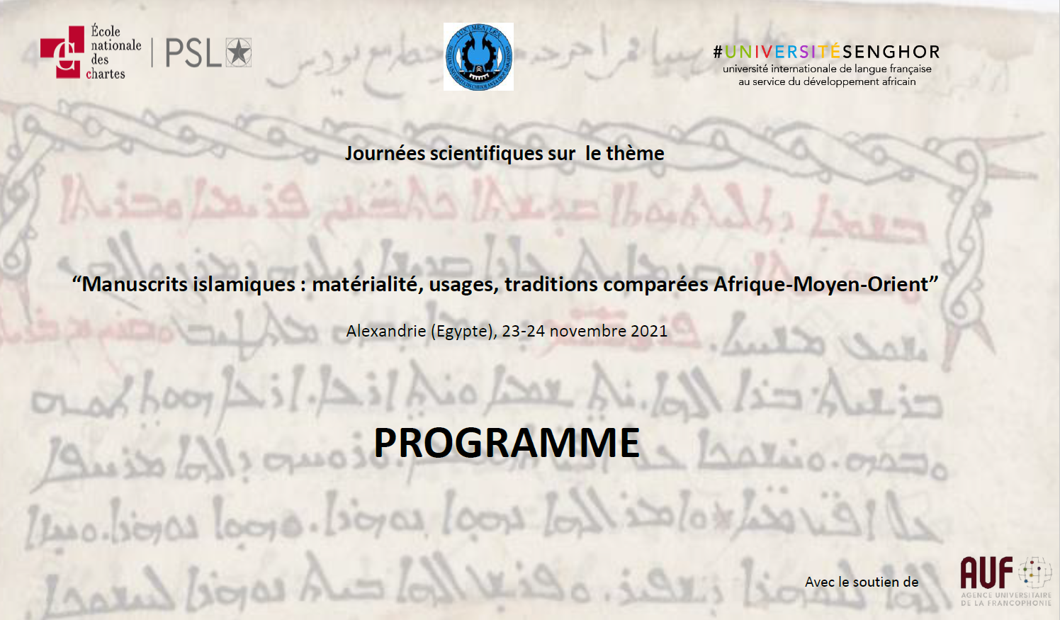 L’Université Senghor d’Alexandrie organise le séminaire « Manuscrits islamiques : matérialité, usages, traditions comparées Afrique-Moyen-Orient », dans le cadre du consortium Senghor-École des chartes-École des bibliothécaires, archivistes, documentalistes, les 23 et 24 novembre 2021. L'AUF est partenaire de ce séminaire.