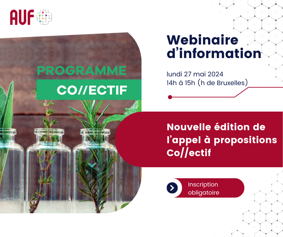 L'AUF – Europe Occidentale organise, le 27 mai 2024 (14h-15h, heure de Bruxelles), un webinaire d'information sur la nouvelle édition de l’appel à propositions Co//ectif.