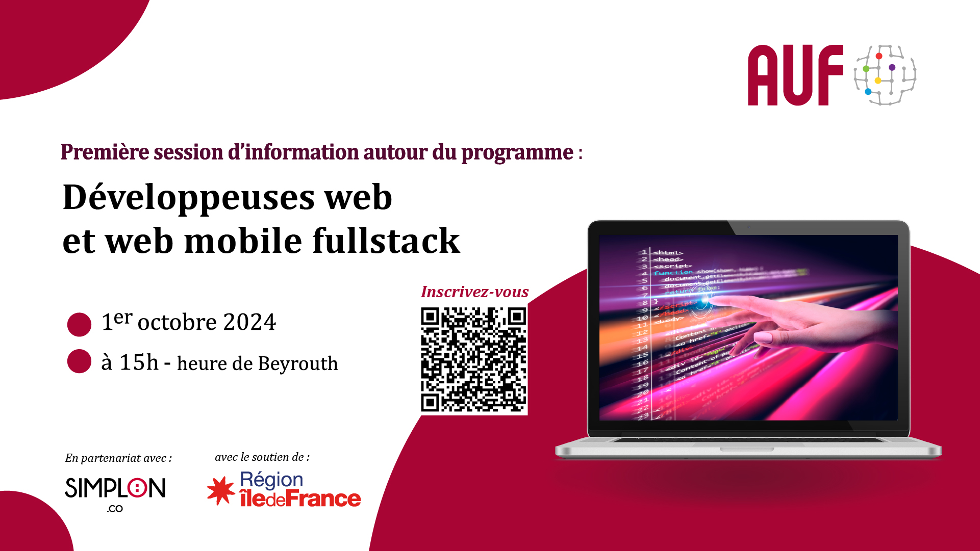 Rejoignez la première session d’information autour du programme de formation professionnelle « Développeuses web et web mobile fullstack », opportunité permettant à des femmes libanaises d’intégrer les métiers du numérique et de s’initier au code, le 1er octobre 2024 à 15h (heure de Beyrouth).