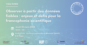 Dans le cadre du mois de la francophonie, l'Agence universitaire de la francophonie (AUF) organise un évènement grand public en collaboration avec l'Organisation internationale de la Francophonie (OIF) sur les enjeux et défis de la francophonie scientifique. Cet évènement sera l'occasion de valoriser l'expertise d'observatoires situés au Québec et soutenus par l'AUF : l'Observatoire francophone pour le développement inclusif par genre, l'Observatoire de la Francophonie économique et l'Observatoire démographique et statistique de l’espace francophone, ainsi que l'Observatoire de la langue française de l'OIF.