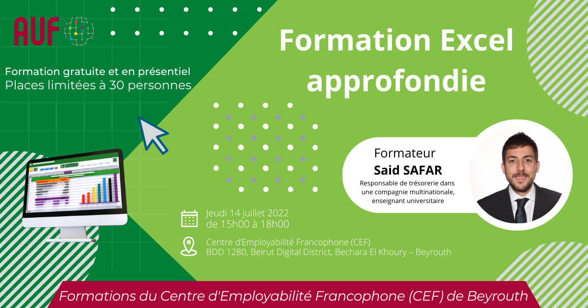 Le Centre d’Employabilité Francophone de Beyrouth (CEF) de l’AUF, organise une « formation Excel approfondie » le 14 juillet, de 15h00 à 18h00, en présentiel au CEF de Beyrouth.