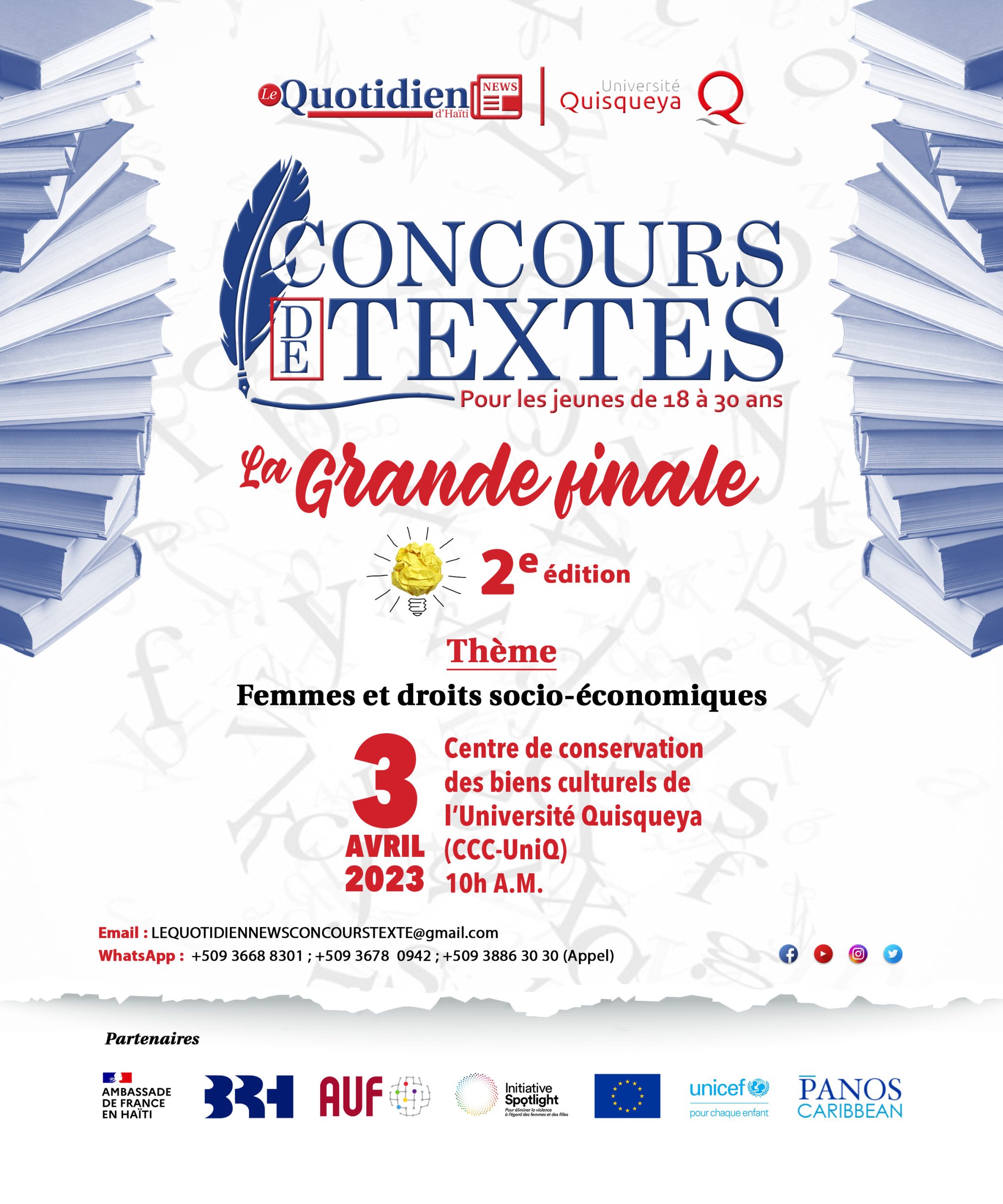 Dans le cadre de la journée internationale des droits de la femme, des étudiants de l’Université Quisqueya affiliés au journal Le Quotidien News organisent avec le soutien de l’Agence Universitaire de la Francophonie (AUF), la grande finale de la deuxième édition de leur concours de textes, le lundi 03 avril 2023. Destiné aux jeunes de 18 à 30 ans, ce concours se réalise sur la thématique: Femmes et droits socio-économique - la violence faite aux femmes en Haïti. Les 15 finalistes qui continueront cette aventure sont donc connus.
