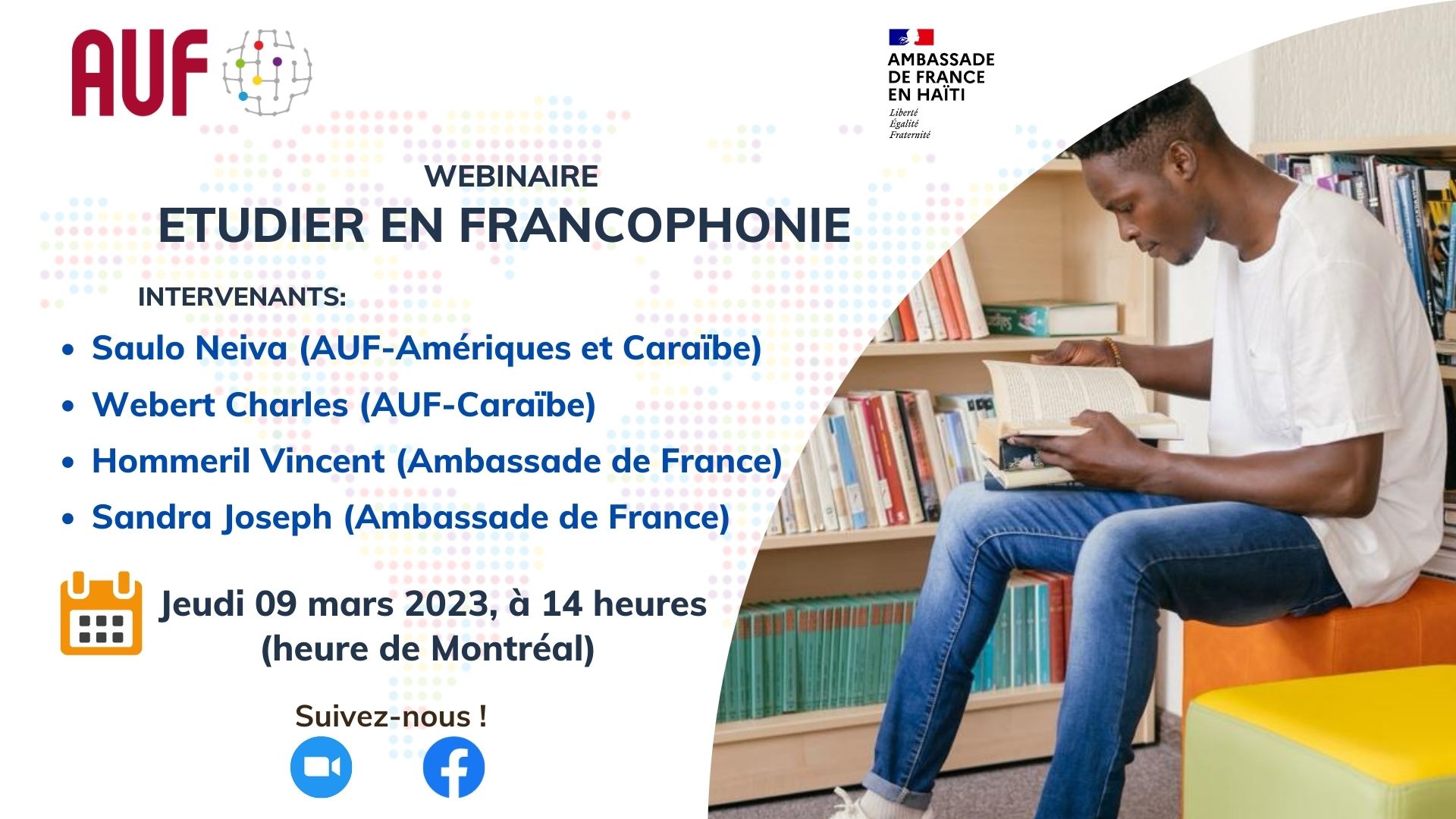 Dans le cadre de la célébration du mois de la Francophonie, l’Agence Universitaire de la Francophonie présente un webinaire sur le thème : « Étudier en Francophonie », le jeudi 9 mars 2023, à 14 heures (heure de Montréal). Ce webinaire va être l’occasion, d’une part, pour l’AUF de présenter l’ESFAM et le Programme de bourse de Mobilité doctorale Antenor Firmin, d’autre part, pour l’Ambassade de France de présenter son programme de bourse Campus France.