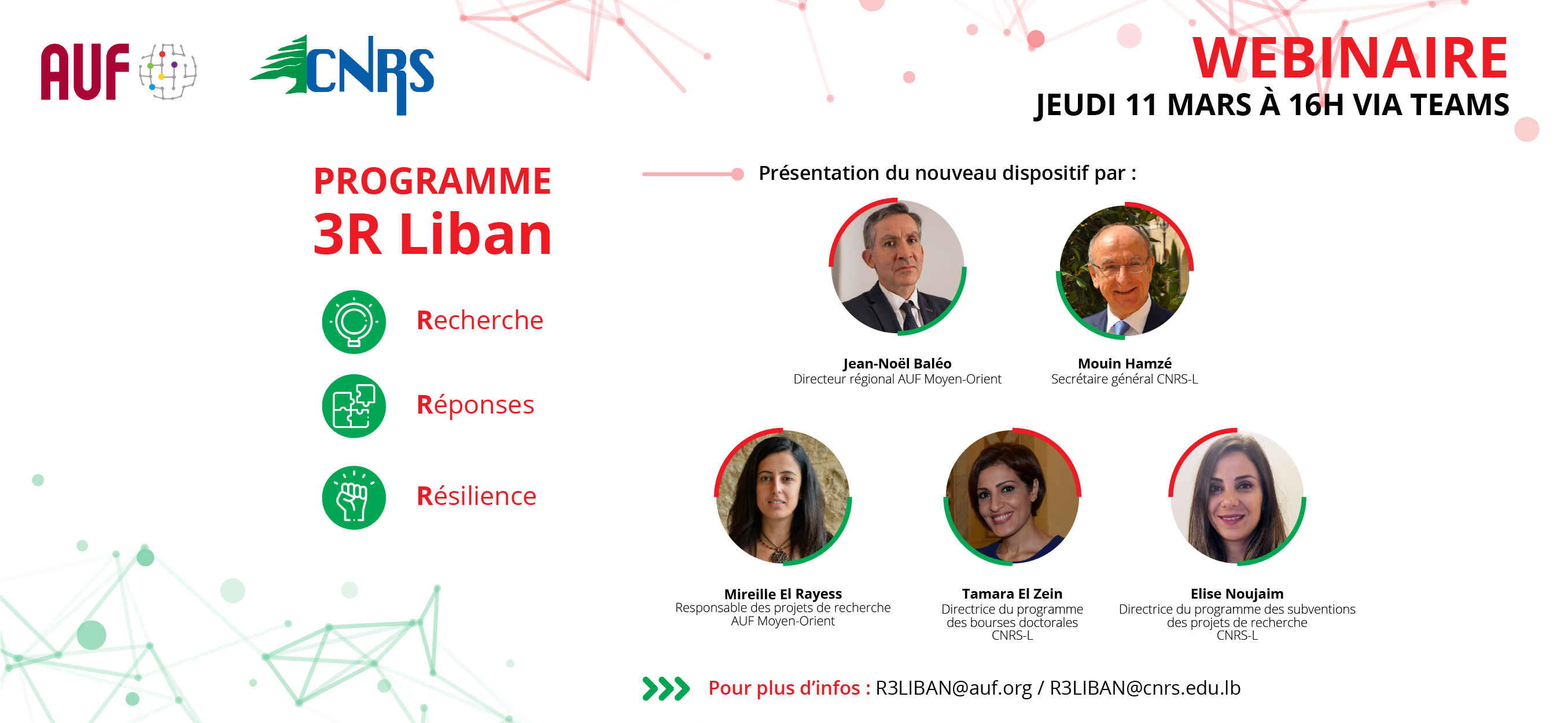 L'AUF Moyen-Orient et le CNRS-L organisent un webinaire ayant pour objectif de présenter le nouveau programme : « 3R Liban : Recherche. Réponses. Résilience. » récemment lancé dans le cadre du Plan AUF spécial Liban, le jeudi 11 mars à 16h, via la plateforme TEAMS.