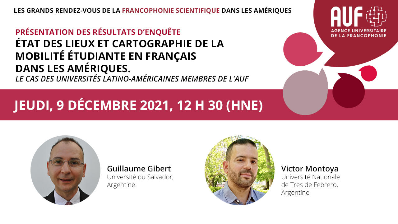 Le jeudi 9 décembre 2021, de 12 h 30 à 14 h, participez au dévoilement des résultats de l’enquête sur la mobilité étudiante en français dans les Amériques en présence des chercheurs, Guillaume Gibert et Victor Montoya