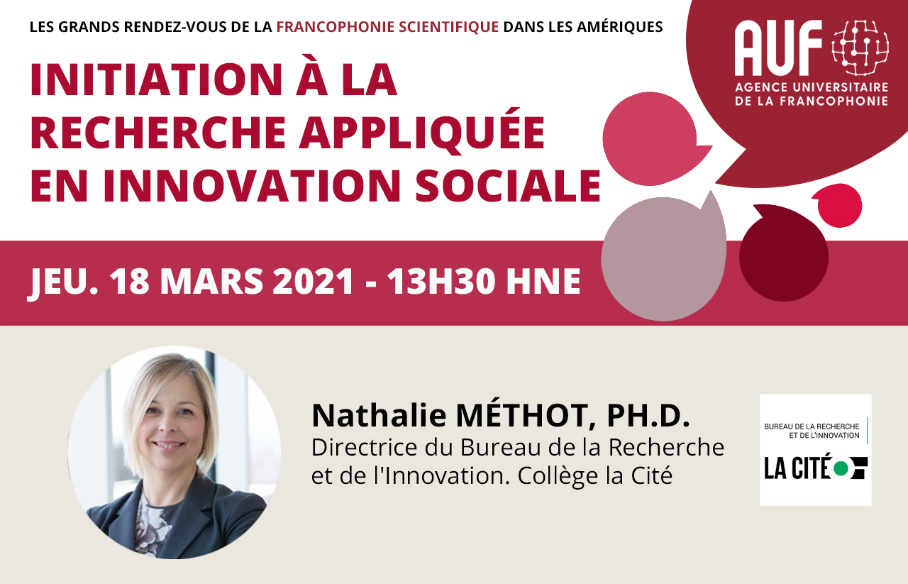 L’AUF Amériques a lancé un cycle de webinaires qui met en valeur les réalisations des chercheur.e.s au sein de ses établissements membres. Les webinaires sont ouverts à toutes et tous. Le 2eme webinaire se tiendra le 18 mars 2021 sur le thème " Initiation à la recherche appliquée en innovation sociale".