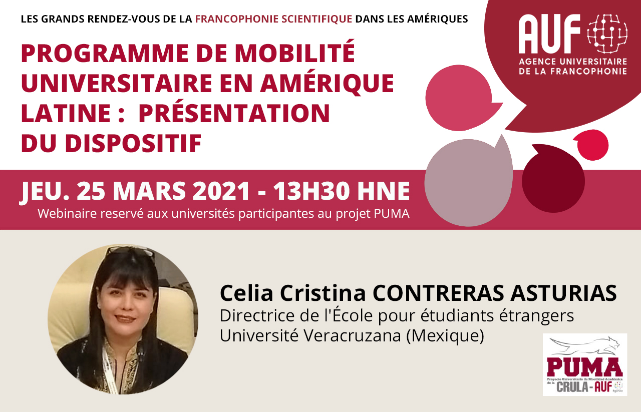 L’AUF Amériques a lancé un cycle de webinaires qui met en valeur les réalisations des chercheur.e.s au sein de ses établissements membres. Les webinaires sont ouverts à toutes et tous. Le 3eme webinaire se tiendra le 25 mars 2021 sur le thème " Programme de mobilité universitaire en Amérique latine : présentation du dispositif".