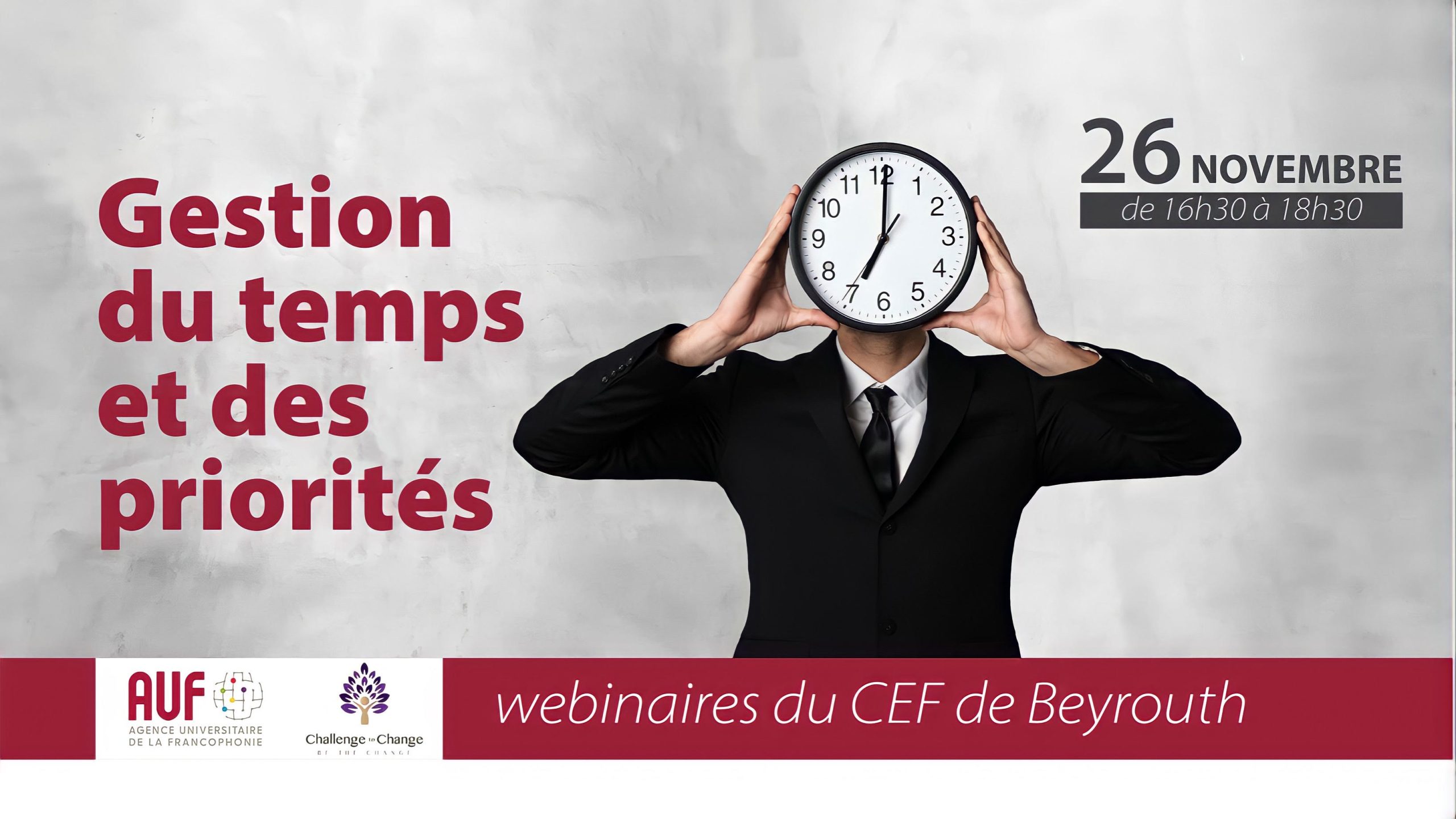 Le Centre d’Employabilité Francophone de Beyrouth (CEF), en collaboration avec Challenge to Change (C2C), vous convie à participer au webinaire « Gestion du temps et des priorités », animé par Mme Pauline Sawaya, fondatrice de MD Swift Shift Coaching & Consultancy.