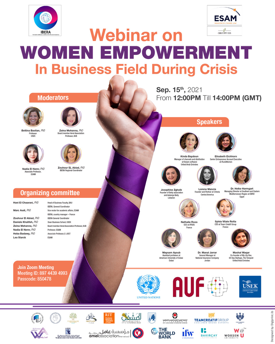Dans le cadre de la collaboration entre l'AUF, l’école de management ESAM, et le réseau IBERA relative au renforcement du rôle des femmes dans le domaine de gestion des entreprises, un webinaire est organisé pour permettre aux participants de profiter de l’expérience de 10 femmes entrepreneures de référence dans leur domaine.