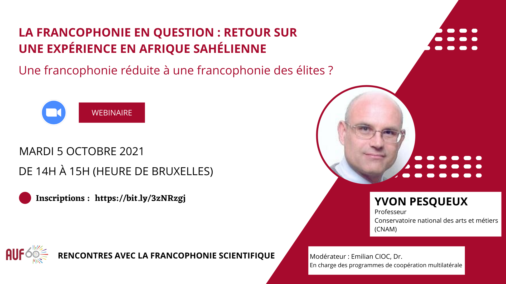 Dans le cadre des Rencontres avec la francophonie scientifique, l'AUF Europe de l'Ouest vous invite à un webinaire le mardi 5 octobre 2021 de 14h à 15h (h de Bruxelles). Il sera animé par M. Yvon PESQUEUX, professeur au Conservatoire national des arts et métiers (CNAM).