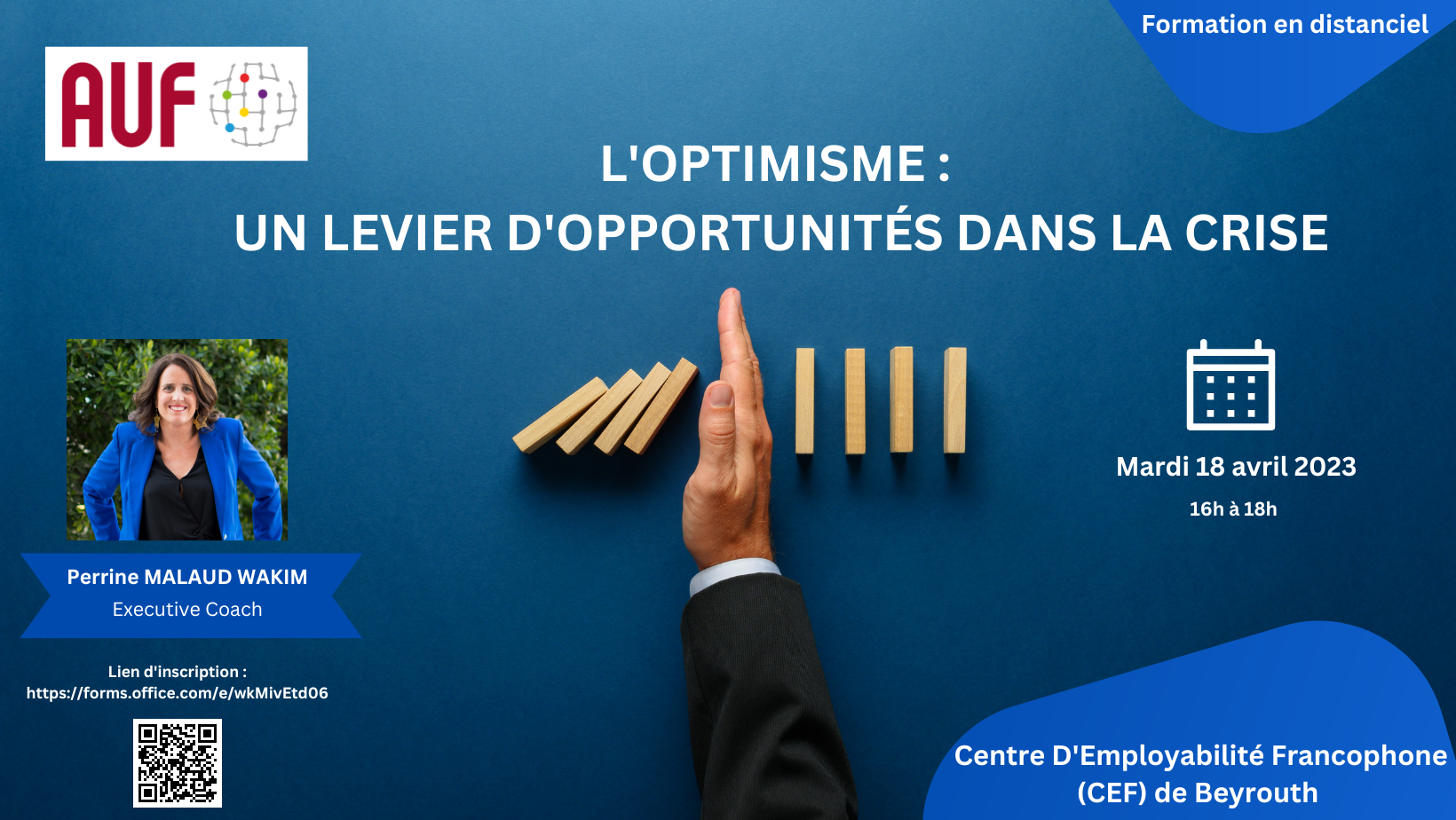 Le Centre d’Employabilité Francophone (CEF) de Beyrouth de l’AUF Moyen-Orient, organise une formation intitulée « L'optimisme, un levier d'opportunités dans la crise », le 18 avril de 16h00 à 18h00 (heure Liban - UTC+3), en distanciel.