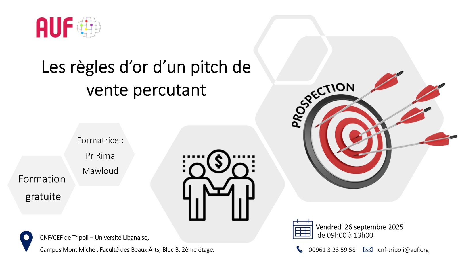 Dans un marché numérique de plus en plus compétitif, maîtriser l’art du discours commercial devient essentiel. Dans ce contexte, le CEF/CNF de Tripoli de l’AUF propose une formation intitulée : « Règles d’or d’un pitch de vente percutant ».