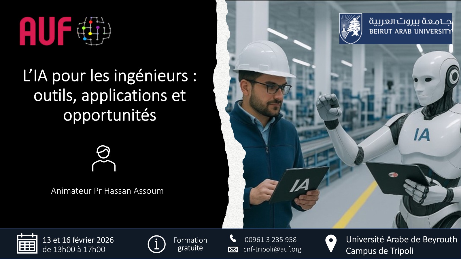 Le CNF/CEF de Tripoli de l'AUF, en collaboration avec l'Université Arabe de Beyrouth - Campus de Tripoli, organise une formation pratique intitulée « L’IA pour les ingénieurs : outils, applications et opportunités ».