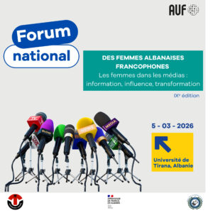 5 mars à 10h : IXème édition du Forum national des femmes albanaises francophones. Thème : « Les femmes dans les médias : information, influence, transformation ».