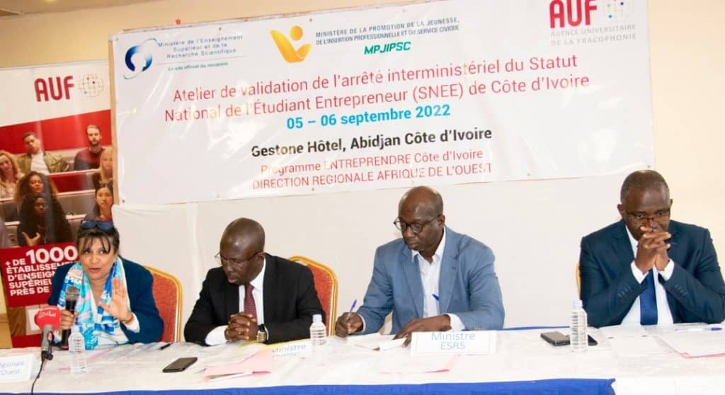 Le ministère de l’Enseignement Supérieur et de la Recherche scientifique à travers l’Observatoire de l’insertion professionnelle des diplômés de l’Enseignement supérieur (OIPDES) et l’Agence universitaire de la Francophonie (AUF) ont organisé du 05 au 06 septembre, à Abidjan, un atelier de validation de l’arrêté interministériel portant sur le statut d’« étudiant-entrepreneur » en Côte d’Ivoire.