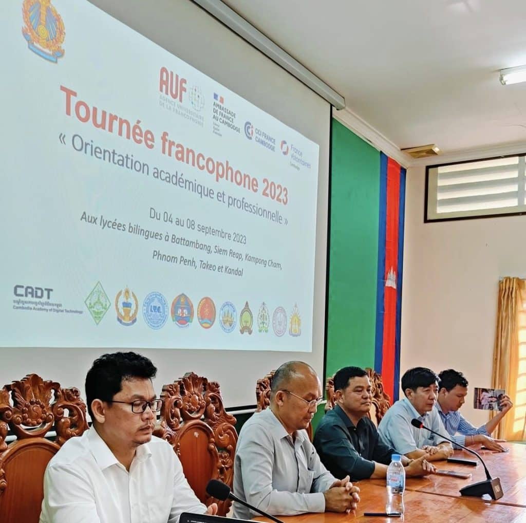 La Tournée Francophone 2023, intitulée « Orientation académique et professionnelle », a été un événement francophone qui a concerné quelques 900 élèves relevant des classes bilingues. La tournée s’est rendue dans six villes et provinces du Cambodge. Les futurs étudiants ont bénéficié d’informations détaillées relatives aux opportunités offertes par les études universitaires et les perspectives professionnelles francophones.