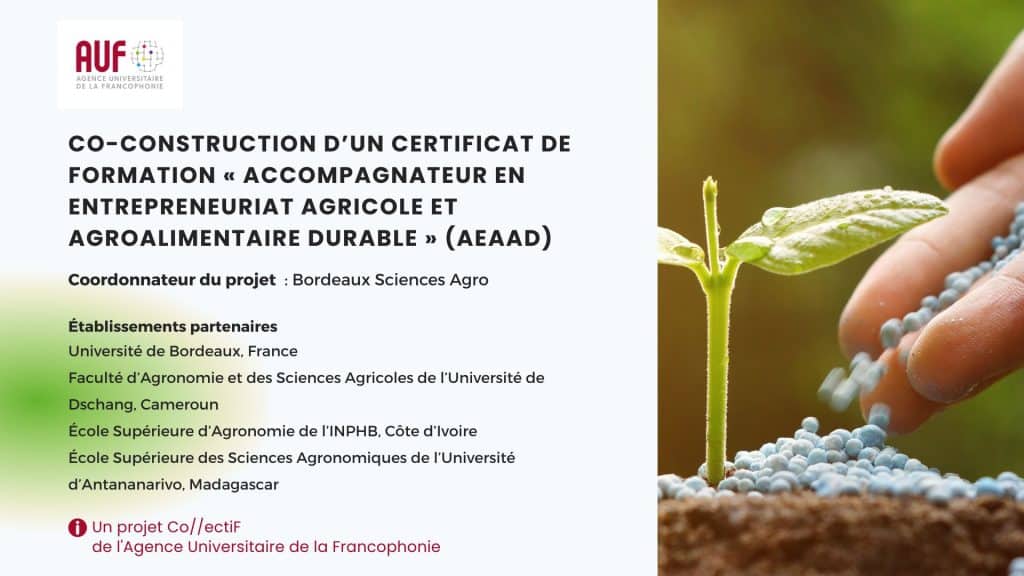 Le projet Co-construction d’un certificat de formation « accompagnateur en entrepreneuriat agricole et agroalimentaire durable » (AEAAD) est coordonné en 2023 par Bordeaux Sciences Agro (France) en partenariat avec un consortium de 4 universités * (Cameroun, Côte d’Ivoire, France et Madagascar). C’est l’un des projets sélectionnés en 2022 au sein du programme Co//ectif** de l’AUF – Europe Occidentale.