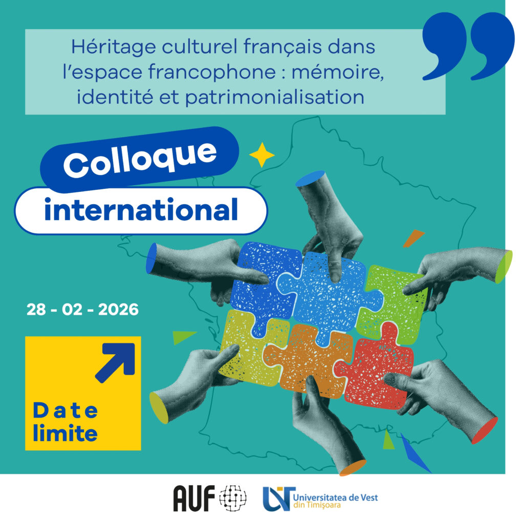 Le colloque international « Héritage culturel français dans l’espace francophone : mémoire, identité et patrimonialisation », organisé par la Chaire Senghor de l’Université de l’Ouest de Timișoara, en partenariat avec la Chaire Senghor de l’Université Jean Moulin Lyon 3 se tiendra le 23 avril 2026 à Timișoara, en présentiel.