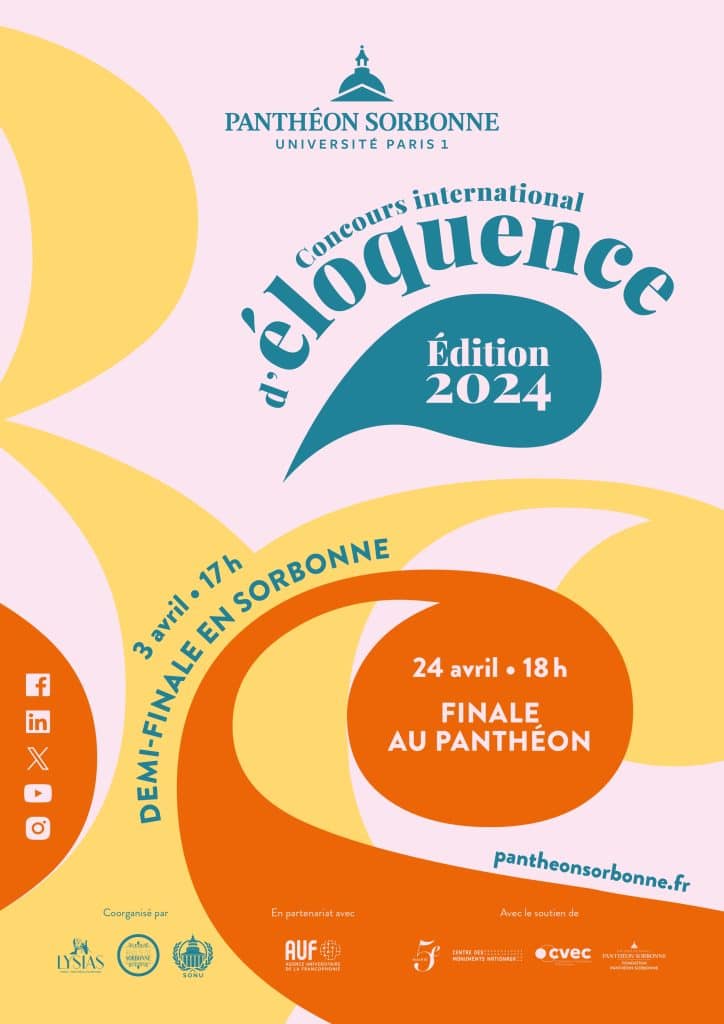 Organisé chaque année, en partenariat avec l’Agence Universitaire de la francophonie (AUF), le Concours international d’éloquence de l’université Paris 1 Panthéon-Sorbonne est ouvert à tous ses étudiants – quelles que soient leurs filières – ainsi qu’aux étudiants francophones à travers le monde. Ce prestigieux concours bénéficie également du soutien de  trois associations étudiantes de pratique de l’éloquence : Lysias Paris 1, SONU et Révolte-toi Sorbonne co-organisatrices depuis 7 ans maintenant.