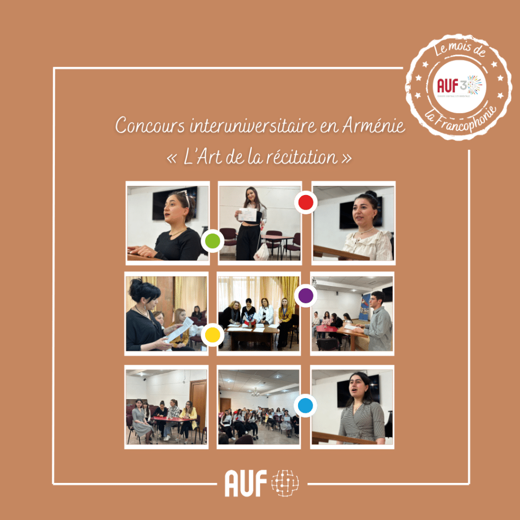 Dans le cadre des activités du Mois de la francophonie, le Bureau National de l’AUF en Arménie, l’Université d’État V. Brusov, Université française en Arménie (UFAR) et le Centre de la Francophonie de la Bibliothèque Centrale Av. Isahakyan ont organisé le 3 avril 2024 le concours « L’art de la récitation ».