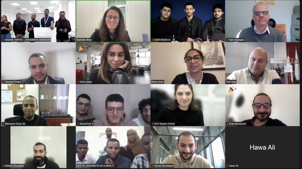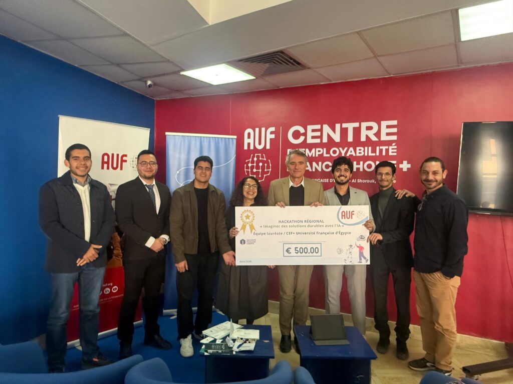 L’AUF a organisé un hackathon régional les samedis 7 et 14 mars 2026, simultanément à Djibouti (en présentiel), en Égypte (Alexandrie et Le Caire, en présentiel) et au Liban (en ligne depuis Beyrouth et Tripoli). 242 étudiants issus d’universités membres de l’AUF dans ces 3 pays, répartis en 59 équipes, ont participé à la 5ᵉ édition du Hackathon régional organisé par l’AUF Moyen-Orient et ont travaillé en équipe afin de concevoir des projets innovants autour du thème : « Imaginer des solutions durables avec l’IA ».