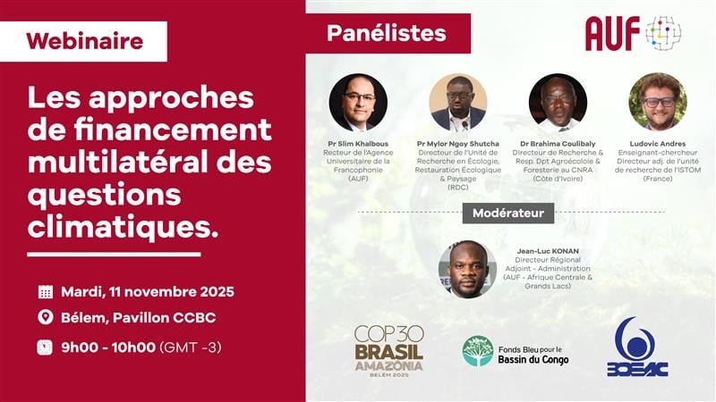 À l’approche de la COP30, l’AUF a réuni le 11 novembre 2025 plusieurs experts francophones pour débattre des défis et leviers liés au financement multilatéral des actions climatiques. Ce webinaire, introduit par le Recteur de l’AUF, le Pr. Slim Khalbous, a mis en lumière la nécessité d’unir compétences scientifiques, capacités de financement et ancrage territorial pour faire émerger des solutions durables et inclusives.