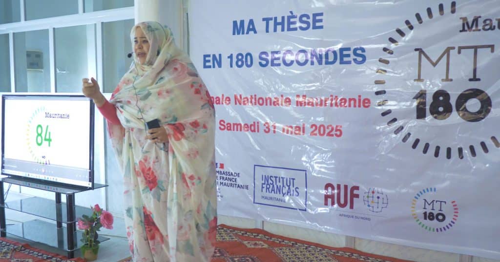 Le Bureau National de l’AUF en Mauritanie a organisé avec le soutien de l’Ambassade de France en Mauritanie, l’Institut Français de Mauritanie et l’Université de Nouakchott, la finale nationale du concours « Ma Thèse en 180 secondes – MT180 » Edition 2025 Mauritanie.