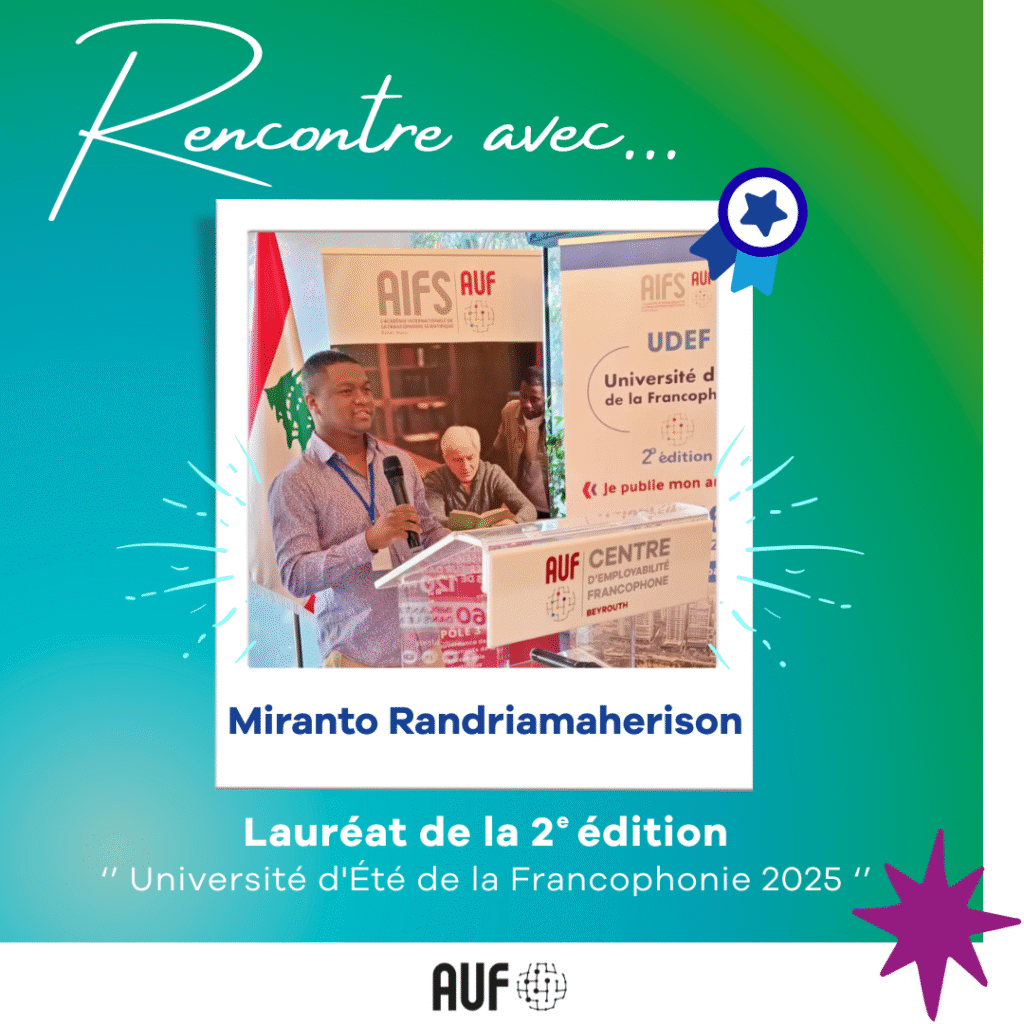 Porteur d’une vision solidaire et ambitieuse de la science, Miranto Randriamaherison incarne la nouvelle génération de chercheurs francophones que l’AUF s’attache à soutenir. Son message pour la communauté des lauréats ? « Continuons à faire vivre une recherche ambitieuse, ouverte et solidaire. Ensemble, nous pouvons montrer que la francophonie scientifique est une force capable d’innover, de transformer nos sociétés et de répondre aux défis de nos territoires. » Un engagement qui, grâce à des initiatives comme l’UDEF, trouve les moyens de s’exprimer et d’essaimer.