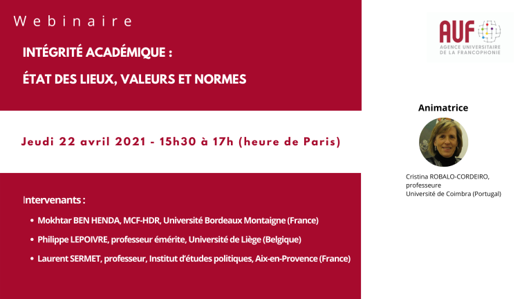 En savoir plusWebinaire “Intégrité académique : état des lieux, valeurs et normes”, jeudi 22 avril à 15h30