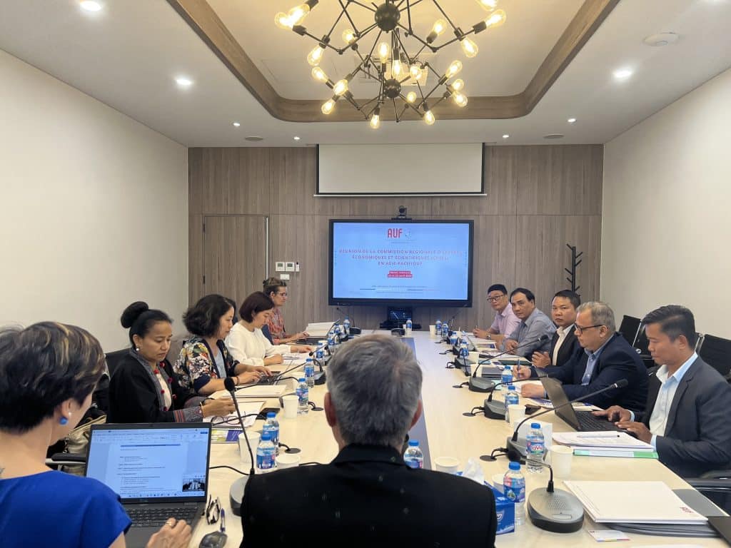 Les discussions se sont poursuivies lors de la deuxième journée de travail avec les activités de l’AUF Asie-Pacifique déclinées selon les 5 axes de la stratégie 2021-2025 : (1) Transformation numérique et gouvernance universitaire ; (2) Employabilité et entrepreneuriat ; (3) Réseautage et coopération internationale universitaire ; (4) Formation des formateurs et innovation pédagogique et (5) Recherche et valorisation scientifique. L’accent a notamment été mis sur l’analyse des projets de recherche et d’innovation reçus (APRI), les états généraux de la recherche ainsi que les activités constitutives de l’Université d’été de la Francophonie (UDEF).