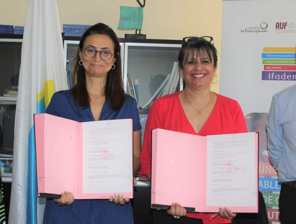 La Directrice régionale de l’AUF-Afrique de l’Ouest, Mme Ouidad TEBBAA et la Directrice de l’Institut Francophone pour l’Éducation et la Formation (IFEF), Mme Mouna LAROUSSI, ont procédé à la signature de convention de partenariat relative à la phase 2022-2026 du programme de l’Initiative francophone pour la formation à distance des maîtres (IFADEM) au Sénégal.