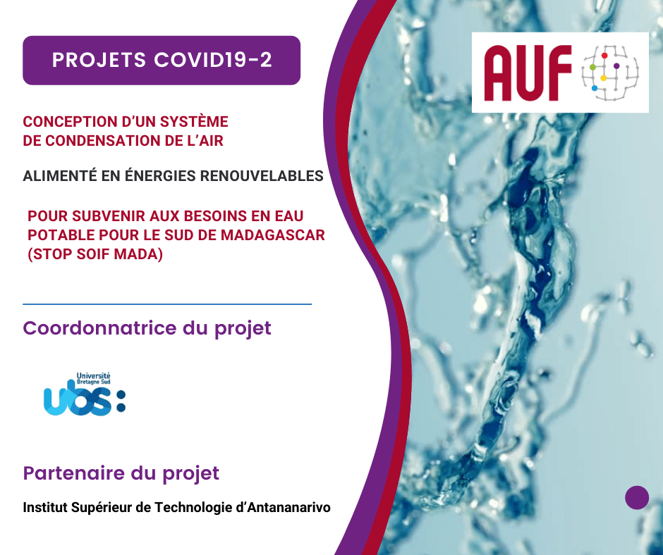 En partenariat avec l’Institut Supérieur de Technologie d’Antananarivo (Madagascar), l’Université de Bretagne Sud (France) travaille depuis le début de l’année sur la conception d’un système de condensation de l’air alimenté en énergies renouvelables pour subvenir aux besoins en eau potable pour le Sud de Madagascar (STOP SOIF MADA).