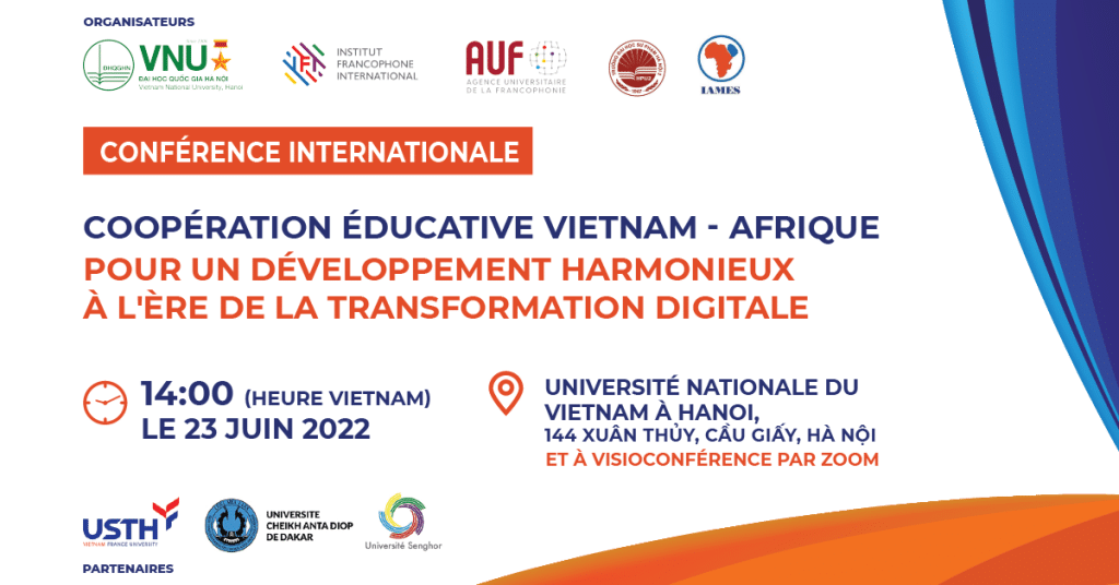 La conférence internationale « Coopération éducative entre le Vietnam et l’Afrique pour un développement harmonieux à l’ère de la transformation digitale » organisée par l’Institut Francophone International (IFI) – Université nationale du Vietnam à Hanoï (UNVH) en collaboration avec l’Agence Universitaire de la Francophonie (AUF) ; l’Institut d’études africaines et moyen-orientales (IAMES) ; l’Université pédagogique de Hanoi 2 (HPU2) ; l’Université des Sciences et des Technologies de Hanoi (USTH) ; l’Université Cheikh Anta Diop de Dakar (Sénégal) et l’Université Senghor (Égypte), a eu lieu à l’Université nationale du Vietnam à Hanoï, et en visioconférence par Zoom, le 23 juin 2022.