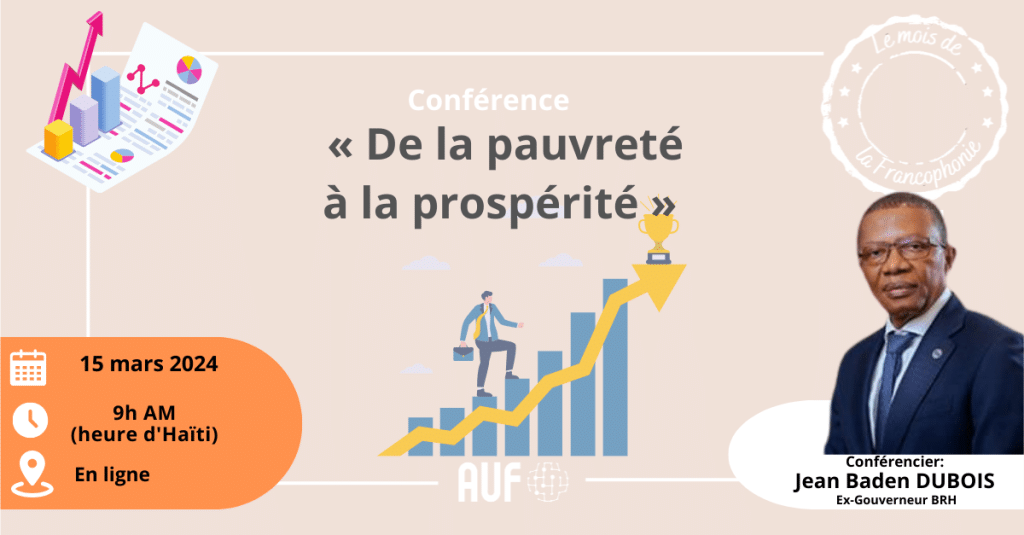 Dans le cadre du mois de la Francophonie, M. Jean Baden Dubois, ex-Gouverneur de la Banque de la République d’Haïti (BRH) propose une conférence sous le thème : “De la pauvreté à la prospérité”, le vendredi 15 mars 2024, en ligne.